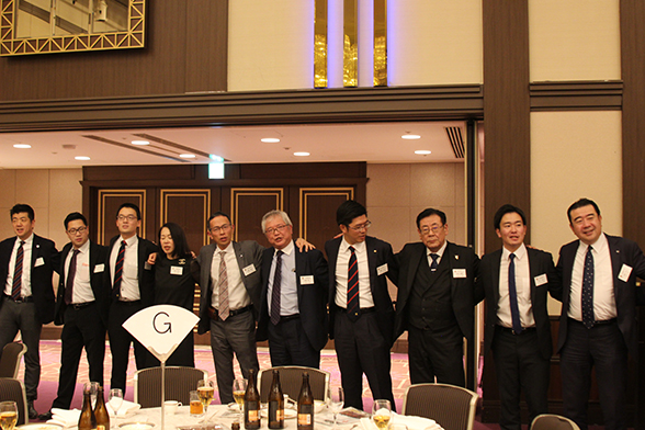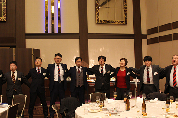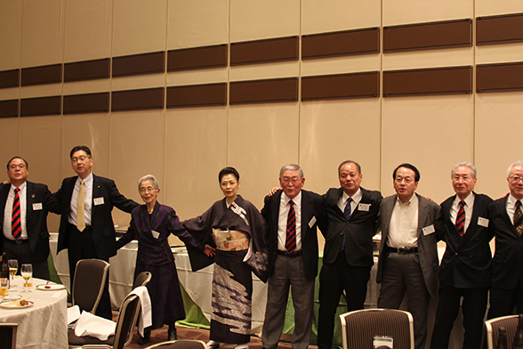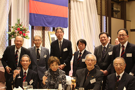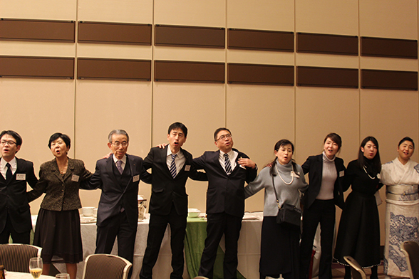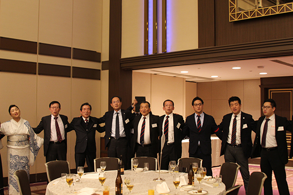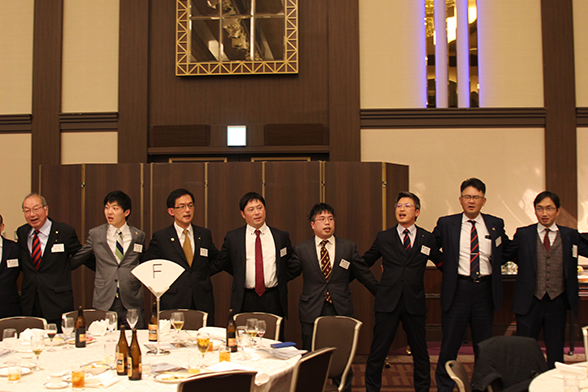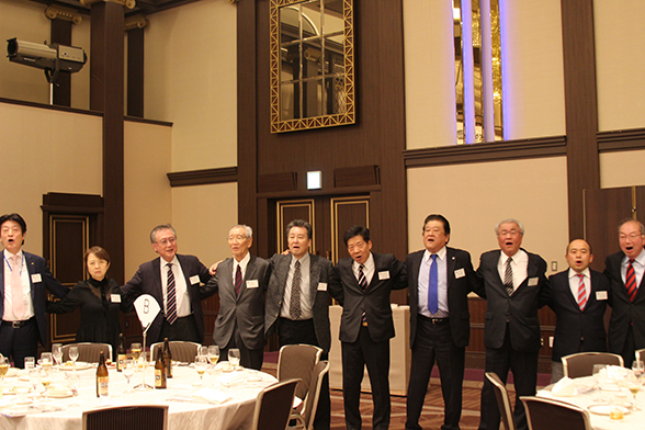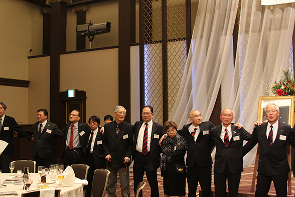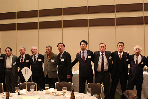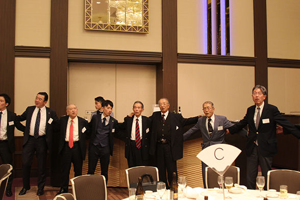 また泉州慶應倶楽部からは本年秋に開催予定である「2020関西合同三田会泉州大会」について、主幹事の西村元秀泉州慶應倶楽部会長より、開催のご案内を頂き、最後に「若き血」を出席者103名で肩を組み合唱して祝賀会を閉会しました。